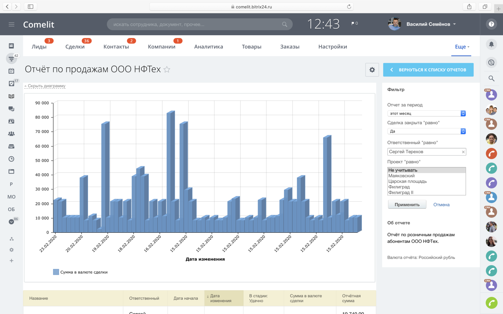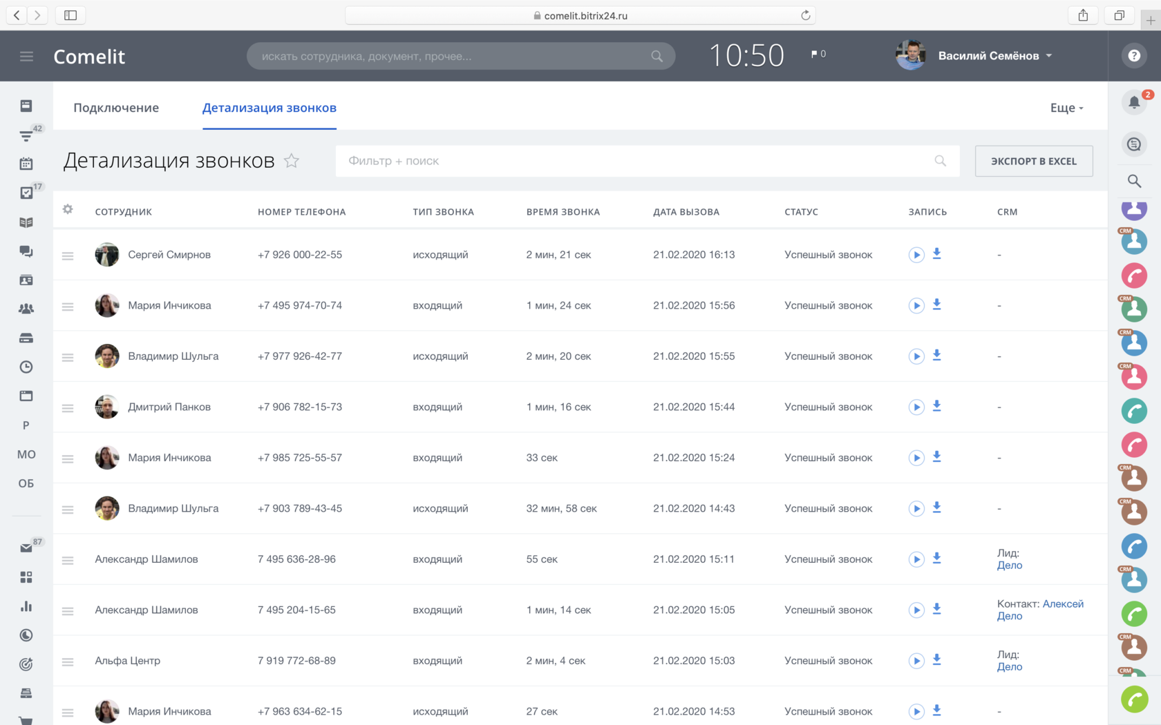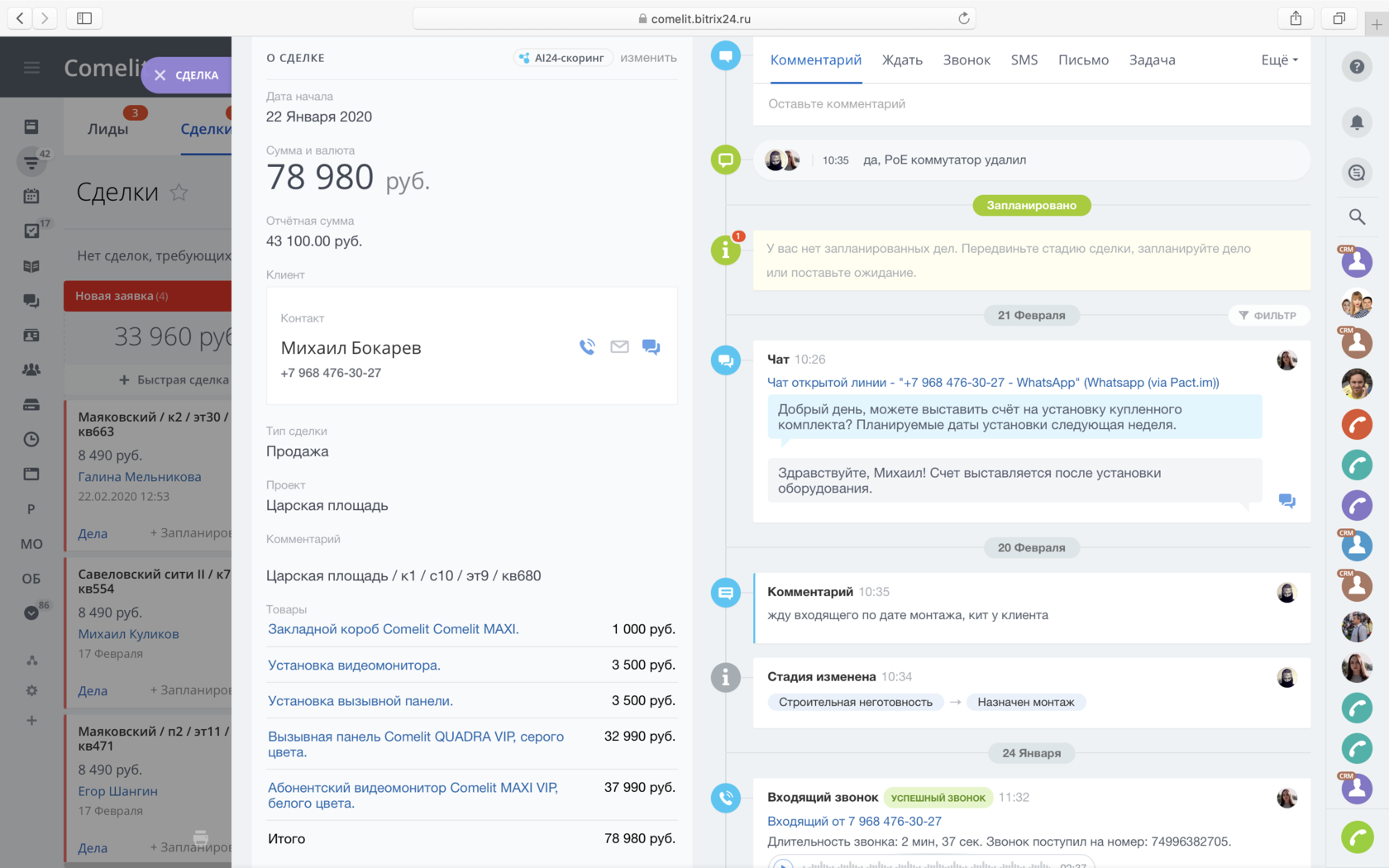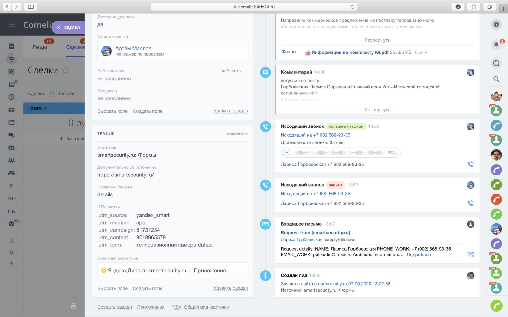 Все разговоры, включая корпоративную мобильную связь, записываются, а записи автоматически прикрепляются к контактам, компаниям и сделкам. Так мы всегда можем обратиться к истории, особенно при решении спорных вопросов.